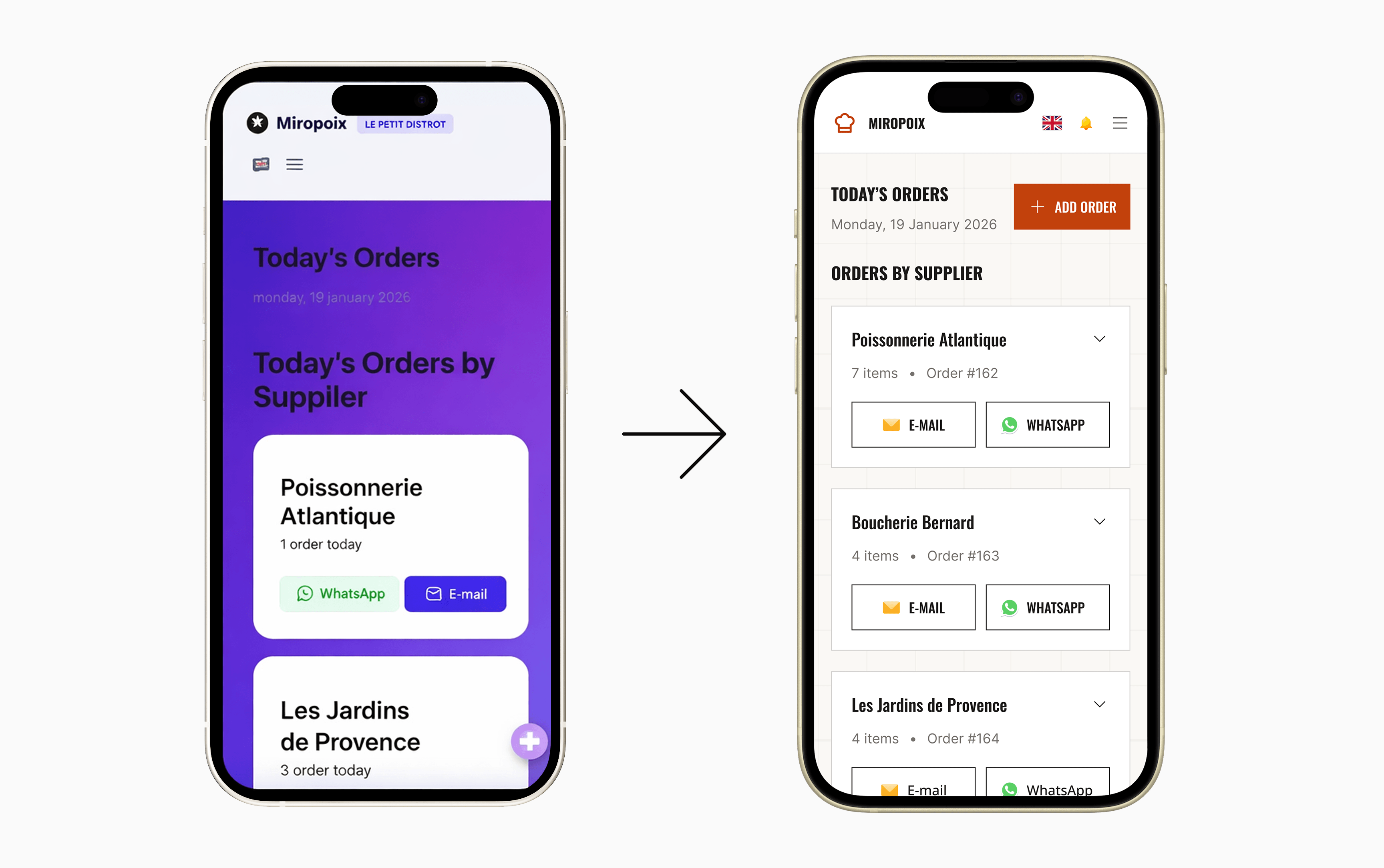 Miropoix to aplikacja SaaS skierowana do zespołów kuchennych. Aplikacja daje zespołowi jedno wspólne narzędzie, w którym każdy kucharz dodaje to, co potrzebuje danego dnia. Lista jest automatycznie segregowana według dostawców, a szef kuchni akceptuje zamówienie i może je wysłać bezpośrednio do hurtowni przez e-mail lub WhatsApp.